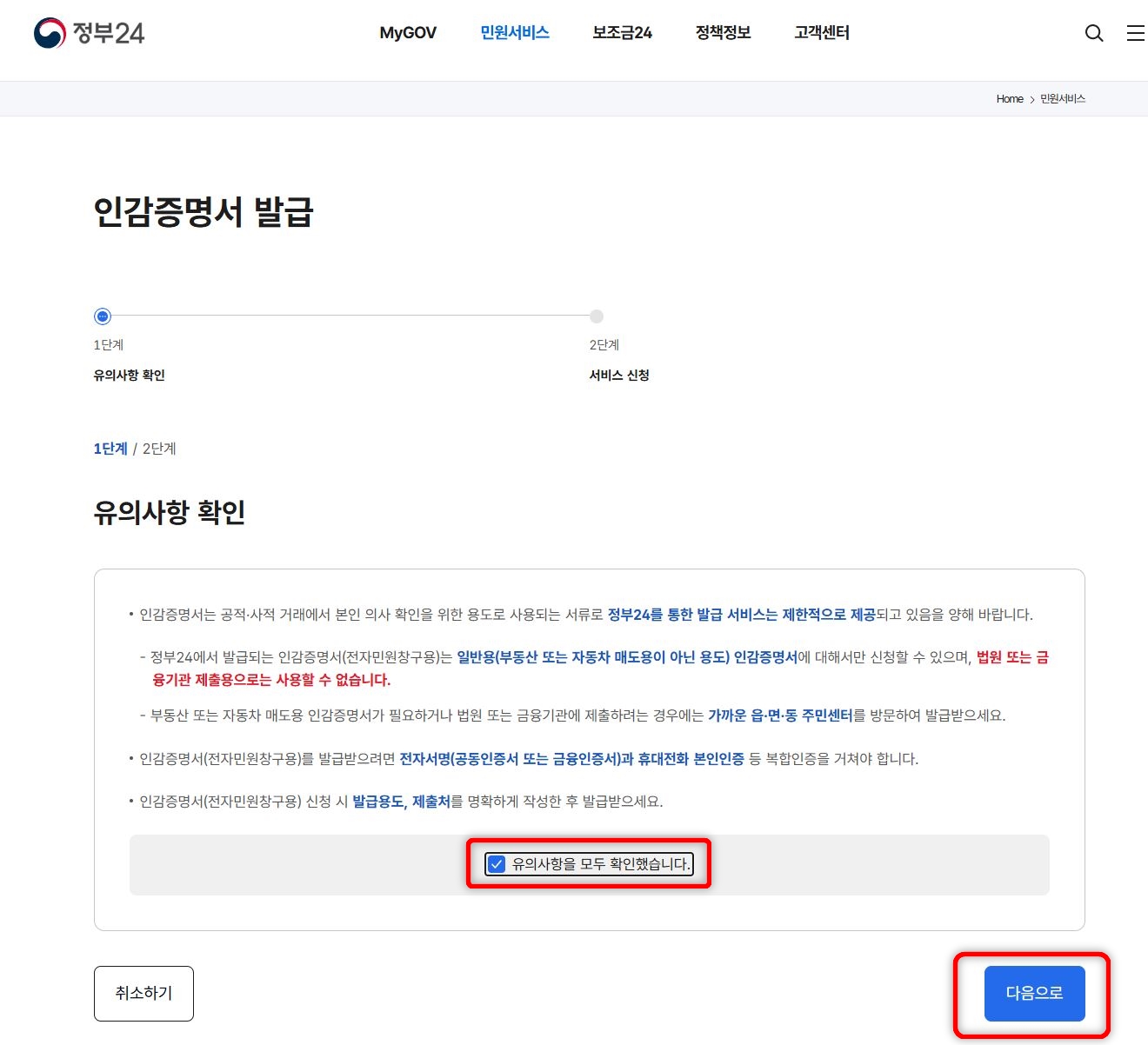 유의사항을 모두 확인하고 체크 후 다음을 선택합니다.