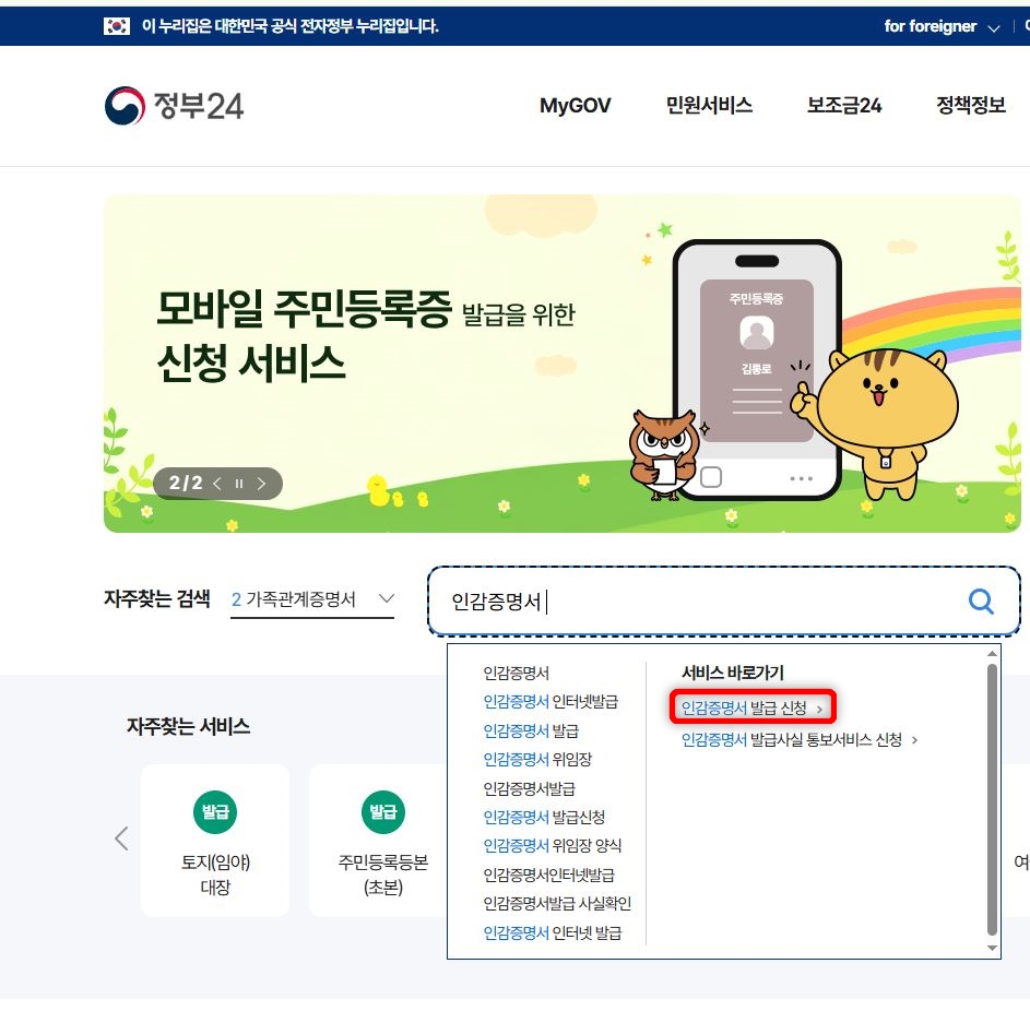 검색창에 "인감증명서"를 검색하고 해당 메뉴를 선택합니다.