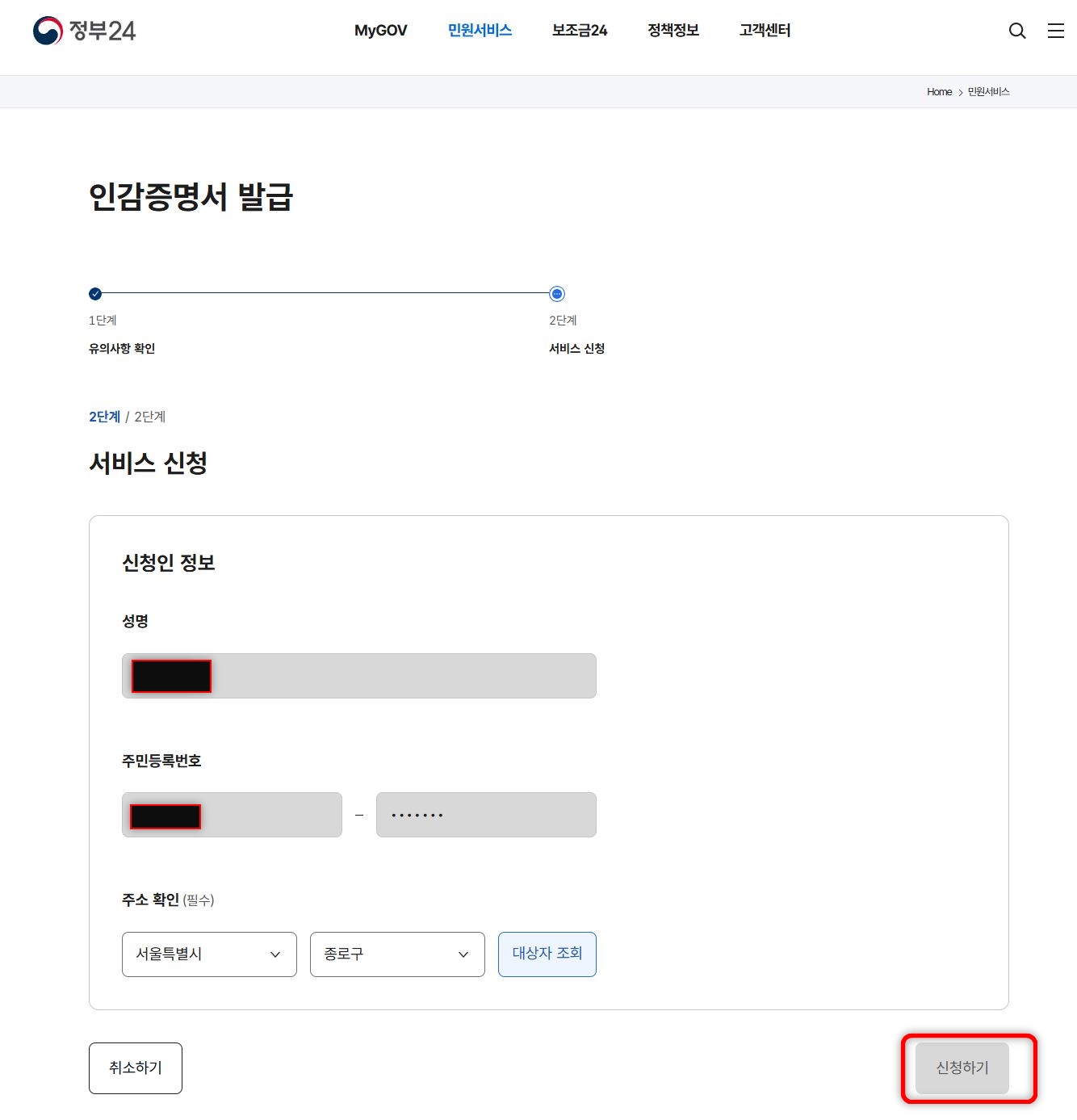 필요한 정보를 입력하고 신청하기를 누르면 인감증명서 발급 완료됩니다.