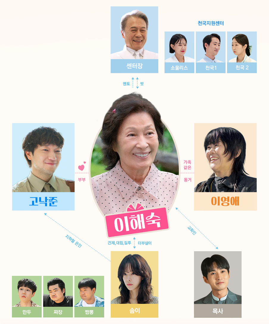 - 이해숙 (김혜자) – 일수업자로 거칠게 살아왔지만, 남편을 지극 정성으로 돌보는 아내. 죽음 이후에도 가족 곁을 맴돕니다.